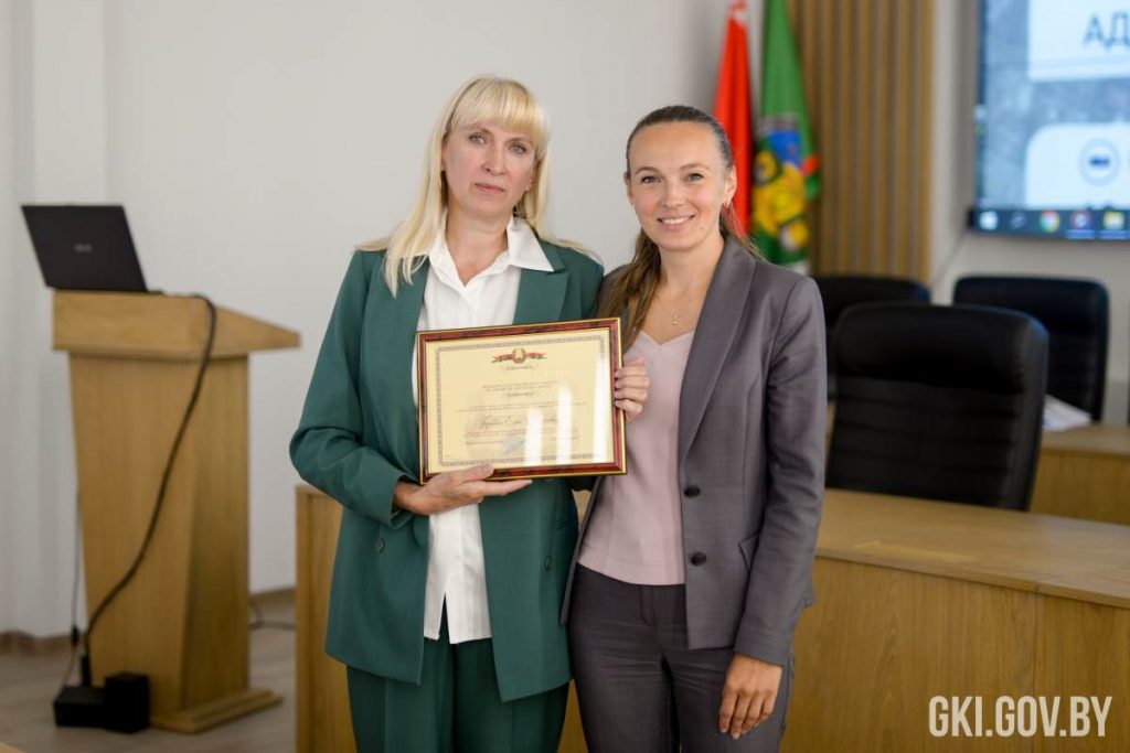 Екатерина Лукьянова также вручила Благодарность Председателя Государственного комитета по имуществу начальнику сектора адресации и обработки информации управления «Кадастр» Витебского агентства по государственной регистрации и земельному кадастру Елене Грубенко, которая была отмечена за высокий профессионализм и вклад в развитие адресной системы Республики Беларусь, а также активное участие в проекте по систематическому присвоению адресов.