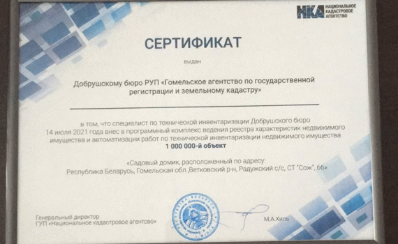 14 июля 2021г в Добрушском бюро Гомельского межгородского филиала «Гомельское агентство по государственной регистрации и земельному кадастру» специалист по технической инвентаризации внес 1 000 000-ый объект в программный комплекс ведения реестра характеристик недвижимого имущества и автоматизации работ по технической инвентаризации недвижимого имущества. Объект — садовый домик в Ветковском районе.