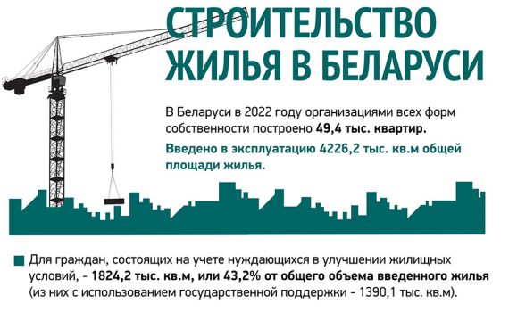 В Беларуси в 2022 году организациями всех форм собственности построено 49,4 тыс. квартир. Введено в эксплуатацию 4226,2 тыс. кв.м общей площади жилья. Для граждан, состоящих на учете нуждающихся в улучшении жилищных условий, — 1824,2 тыс. кв.м, или 43,2% от общего объема введенного жилья (из них с использованием государственной поддержки — […]