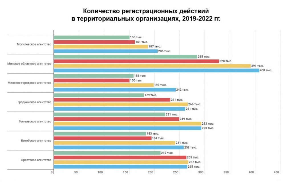 Анализируя динамику регистрационных действий в разрезе регистрационных округов, можно отметить, что по сравнению с 2021 годом наибольший рост зафиксирован в Минском городском агентстве (+22%). Годом ранее организация также показала самый большой прирост среди регистрационных округов.