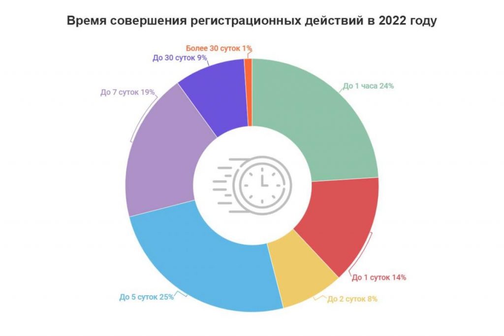 Стоит добавить, что в 2022 году время совершения 24% регистрационных действий не превысило 1 часа. По сравнению с 2021 годом этот показатель вырос на 2%.