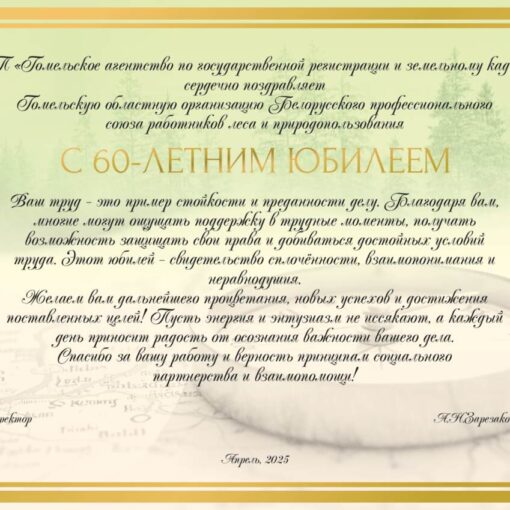 РУП «Гомельское агентство по государственной регистрации и земельному кадастру» поздравляет Гомельскую областную организацию Белорусского профессионального союза работников леса и природопользования с 60-летним […]