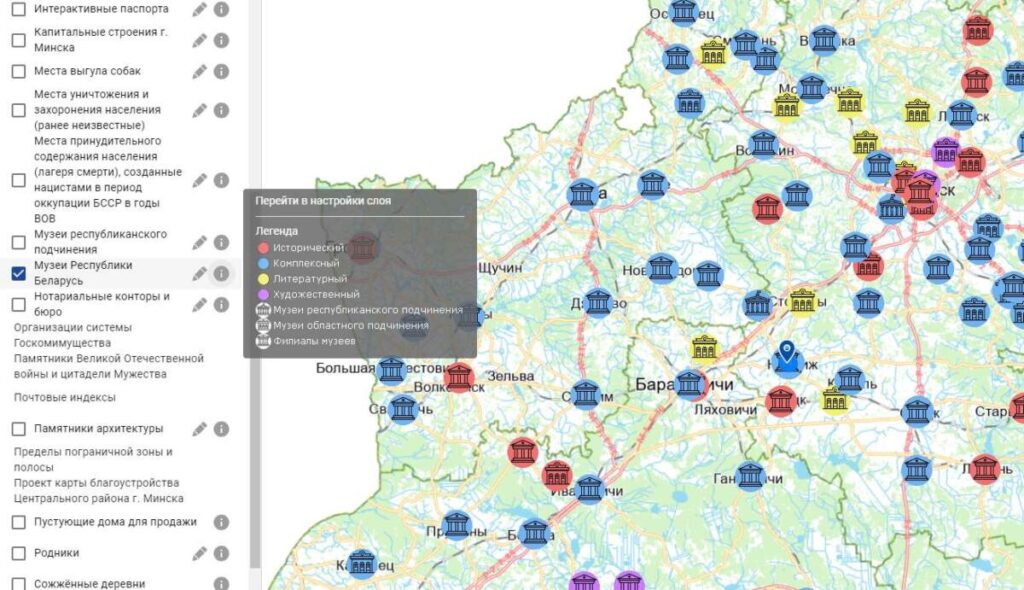 Информационный слой «Музеи республиканского подчинения» на Публичной кадастровой карте дополнен геопространственной информацией о всех музеях страны на основании официальных данных Государственного реестра музеев Республики Беларусь. В результате слой значительно «вырос» и теперь содержит сведения о 319 музеях, а еще мы поменяли название, — теперь это «Музеи Республики Беларусь».
